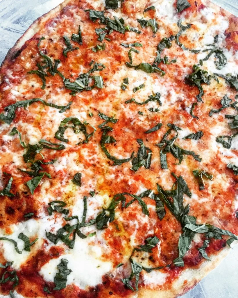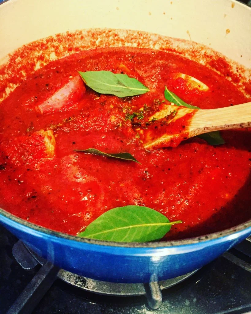 Another important component to a great pizza is the sauce! I keep mine really simple with Whole San Marzano tomatoes pureed and I simmer with 1 whole onion, a couple cloves of garlic, a quarter cup of olive oil, bay leaves and fresh oregano. Season with a little salt and pepper.